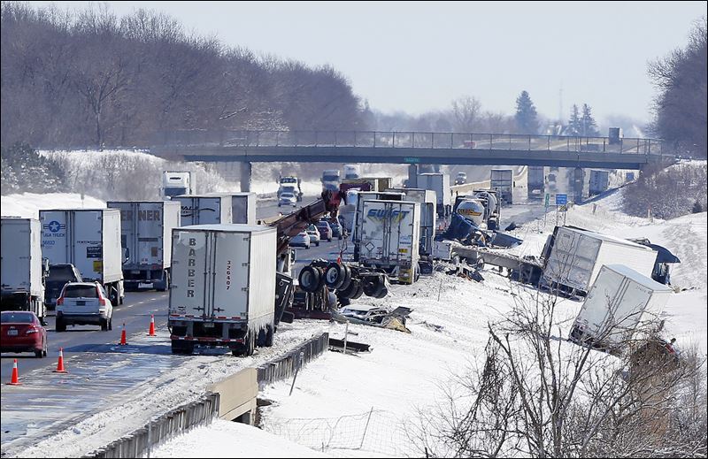 -- Seven people were injured when a tractor-trailer crashed into a minivan stopped on the Ohio Turnpike’s eastbound shoulder near Swanton early Friday afternoon, causing a five-mile backup, authorities said... The truck driver, who was conscious and alert after the crash but had to be extricated from his vehicle’s wreckage, was taken to Mercy St. Vincent Medical Center... As of Friday evening, only the truck driver, Alfred Cruz, 55, of Portage, Ind., had been identified. The people in the minivan were members of an extended family from Minnesota, according to a highway patrol statement, and all were taken to the hospital even though only six were believed injured, two seriously... (Photo: Poor visibility likely played role in Ohio Turnpike pileup ... Crews clean the remains of a multivehicle accident in the eastbound lane of the Ohio Turnpike near the County Road 268 overpass near Clyde on Thursday) - Swanton,OH,USA -The Toledo Blade -7 March 2015